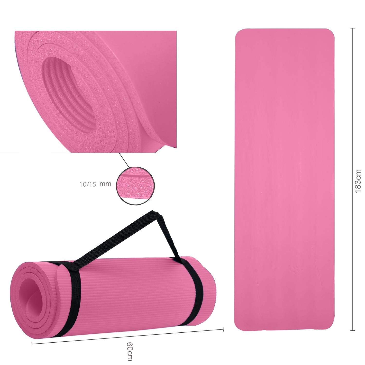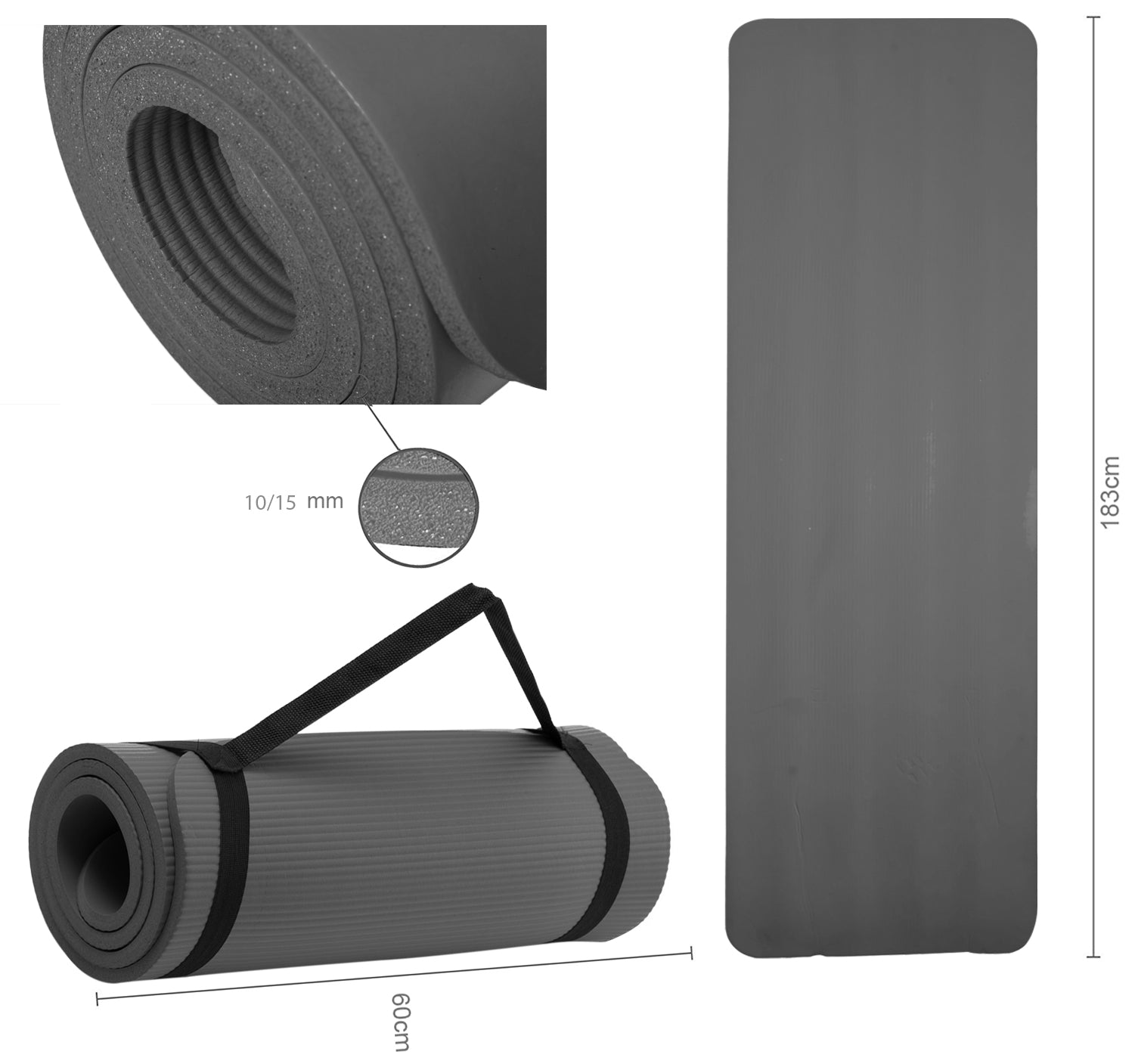 Our exercise mats are made from the highest quality NBR foam and are either 10 or 15mm thick. This helps keep your joints and feet from hurting so you have optimum comfort for the duration of your workout, be it gym work, yoga or Pilates. All our exercise mats come with a free carry strap which makes it easy for you to take to the gym, yoga, or a Pilates class. Simply roll your mat up and slot it into the easy to use straps and you are ready to go! The exercise mats are 183cm x 60cm x 10mm or 15mm which is the perfect size and thickness for you to do almost any exercise routine with the highest level of comfort. They come in three different colours: Blue, Graphite or Pink